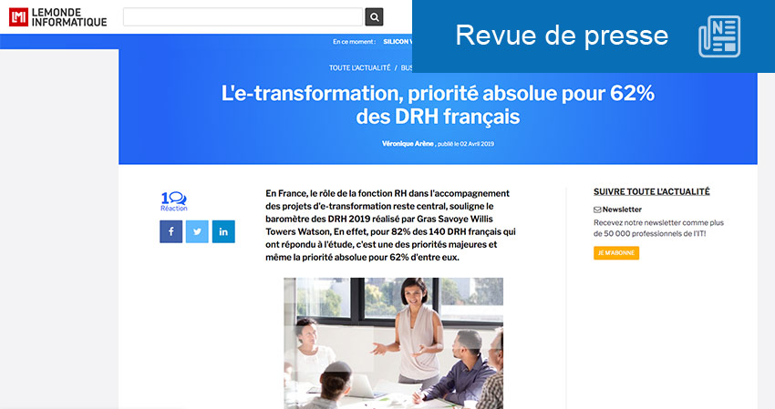 Ce n’est pas un hasard si le cabinet de conseil Gras Savoye Willis Towers Watson, avec RH&M et ABV Group a choisi pour son baromètre des DRH 2019 de mettre les DRH au cœur des projets de digitalisation. Et pour cause, l’ accompagnement des DRH à l’e-transformation est essentiel pour l’entreprise qui souhaite entamer sa transition numérique. Selon Le Monde Informatique qui a pris connaissance de cette étude, sur les 140 DRH d’entreprises et industries de toutes tailles et tous secteurs dans l’Hexagone interrogés, 82% sont convaincus que la transformation numérique de leur entreprise est la priorité, 62% d’entre eux pensent même que c’est une priorité absolue.