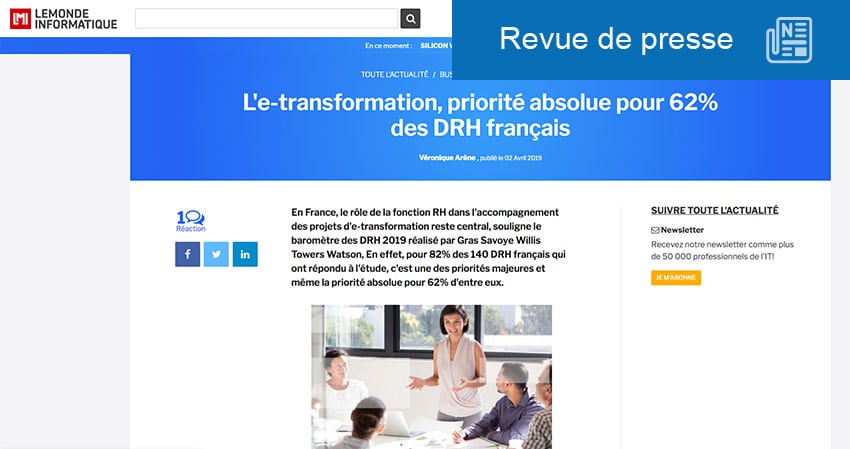 Ce n’est pas un hasard si le cabinet de conseil Gras Savoye Willis Towers Watson, avec RH&M et ABV Group a choisi pour son baromètre des DRH 2019 de mettre les DRH au cœur des projets de digitalisation. Et pour cause, l’ accompagnement des DRH à l’e-transformation est essentiel pour l’entreprise qui souhaite entamer sa […]