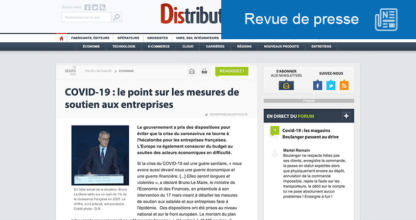 Face à la crise engendrée par la pandémie du Covid 19, des mesures pour venir en aide aux entreprises ont été mises en place par le gouvernement français, peut-on voir sur le site Distributique.com. 8,5 Md€ vont être ainsi consacrés aux mesures de chômage partiel auxquelles peuvent recourir les sociétés devant cesser tout ou partie de leurs activités. S’ajoutent également des mesures de report des charges fiscales (impôts directs uniquement) et sociales dues pour le mois de mars. Elles participent à hauteur de 32 Md$ au plan de soutien global de l’Etat. Le dernier volet du plan d’urgence prévoit un fonds de solidarité qui va représenter 2 Md$ de dépenses publique sur deux mois. Il s’adresse aux petites entreprises qui ont dû fermer pour se conformer aux mesures sanitaires (café, restaurants, tourisme) et à celles qui auront perdu plus de 70% de leur chiffre d’affaires entre mars 2019 et mars 2020.