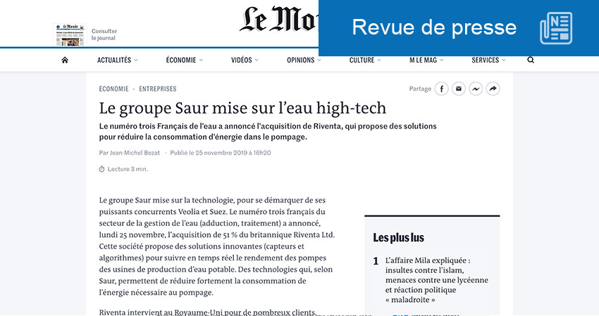 Réduire la consommation d’énergie dans le pompage, c’est l’objectif affiché du groupe Saur. Le numéro 3 de l’eau a annoncé l’acquisition de Riventa, souligne le site du Monde. Cette société propose des solutions pour suivre en temps réel le rendement des pompes des usines de production d’eau potable. Cette technologie innovante ont permis de réaliser des économies d’énergie annuelles de plus de 20 %, assure le groupe et ses dirigeants qui ont décidé de la déployer sur 64 sites en 2020. L’eau est au au centre de l’économie circulaire. Cette énergie représente le premier poste de dépenses dans l’exploitation d’une usine de production d’eau potable.