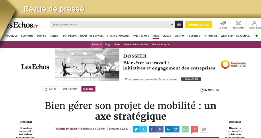 Cet article, tiré du site internet du quotidien Les Echos, nous renseigne sur l’omniprésence du phénomène de mobilité dans les entreprises. Un sujet que nous avons traité à plusieurs reprises, sur notre blog, à travers différents articles, notamment concernant l’utilisation d’une flotte informatique, ou parc informatique. La digitalisation de l’entreprise et des rapports professionnels est bien un sujet à suivre de près.