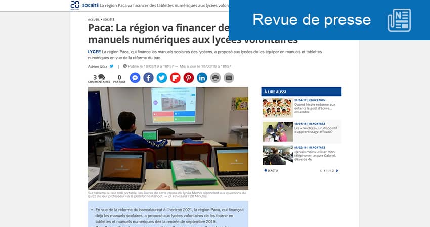 En vue de la réforme du bac à l’horizon 2021, la région Paca propose aux élèves de seconde et de première des tablettes tactiles multimédia connectées sur lesquelles les manuels scolaires numériques seront disponibles. « La région s’est chargée de consulter les chefs d’établissements en leur laissant la liberté du choix de passer à des manuels numériques, ou de rester à des manuels papier », souligne l’Académie d’Aix-Marseille. Selon le rectorat, environ 70 % des proviseurs se se sont montrés favorables aux manuels numériques, peut-on lire sur le site de 20 Minutes. Jusqu’à présent, la Région assurait la gratuité des manuels scolaires papiers pour les 171.000 élèves. Elle évalue le coût de fourniture des tablettes et des manuels numériques à près de 80 millions d’euros sur quatre ans, dont 23 millions pour la première année. Un syndicat d’enseignants interrogé à ce sujet s’inquiète du bon fonctionnement et de la maintenance des tablettes numériques.