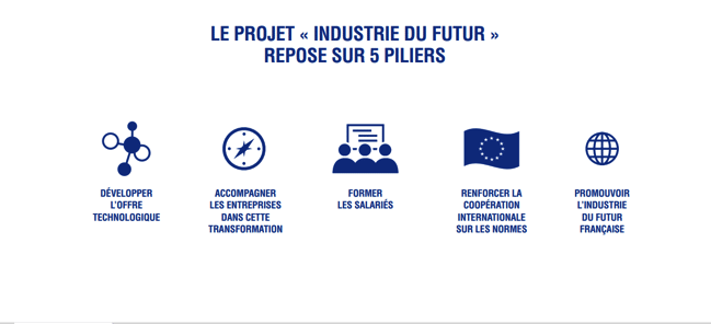 Le gouvernement français semble convaincu de l'importance de la digitalisation de l'industrie et a initié des démarches en ce sens. Au printemps 2015 a ainsi été officiellement lancé le plan industrie du futur. Faisant suite au plan « usine du Futur », ce vaste dispositif d'état s’appuie sur 5 piliers (cf ci-dessous) et affiche l'objectif « d’amener chaque entreprise à franchir un pas sur la voie de la modernisation de son outil industriel et de la transformation de son modèle économique par le numérique ».
